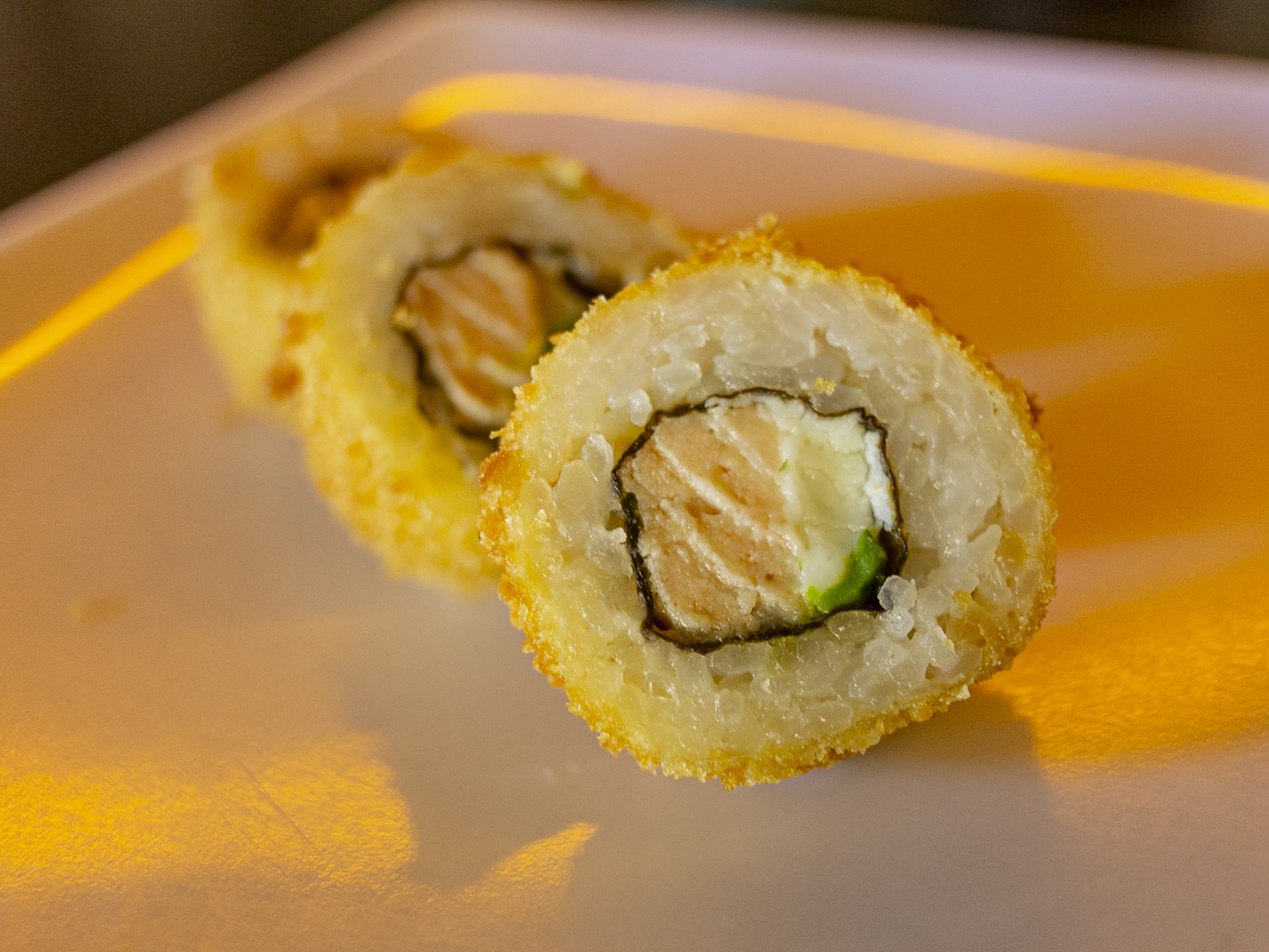Rollo frito relleno de salmón, aguacate y philadelphia