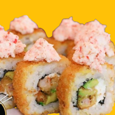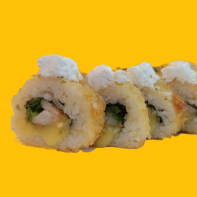 Rollo frito, relleno de aguacate, philadelphia y camarón empanizado, por fuera pasta tampico.