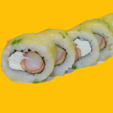Camarón, philadelphia y aguacate, envuelto en tocino y manchego gratinado.