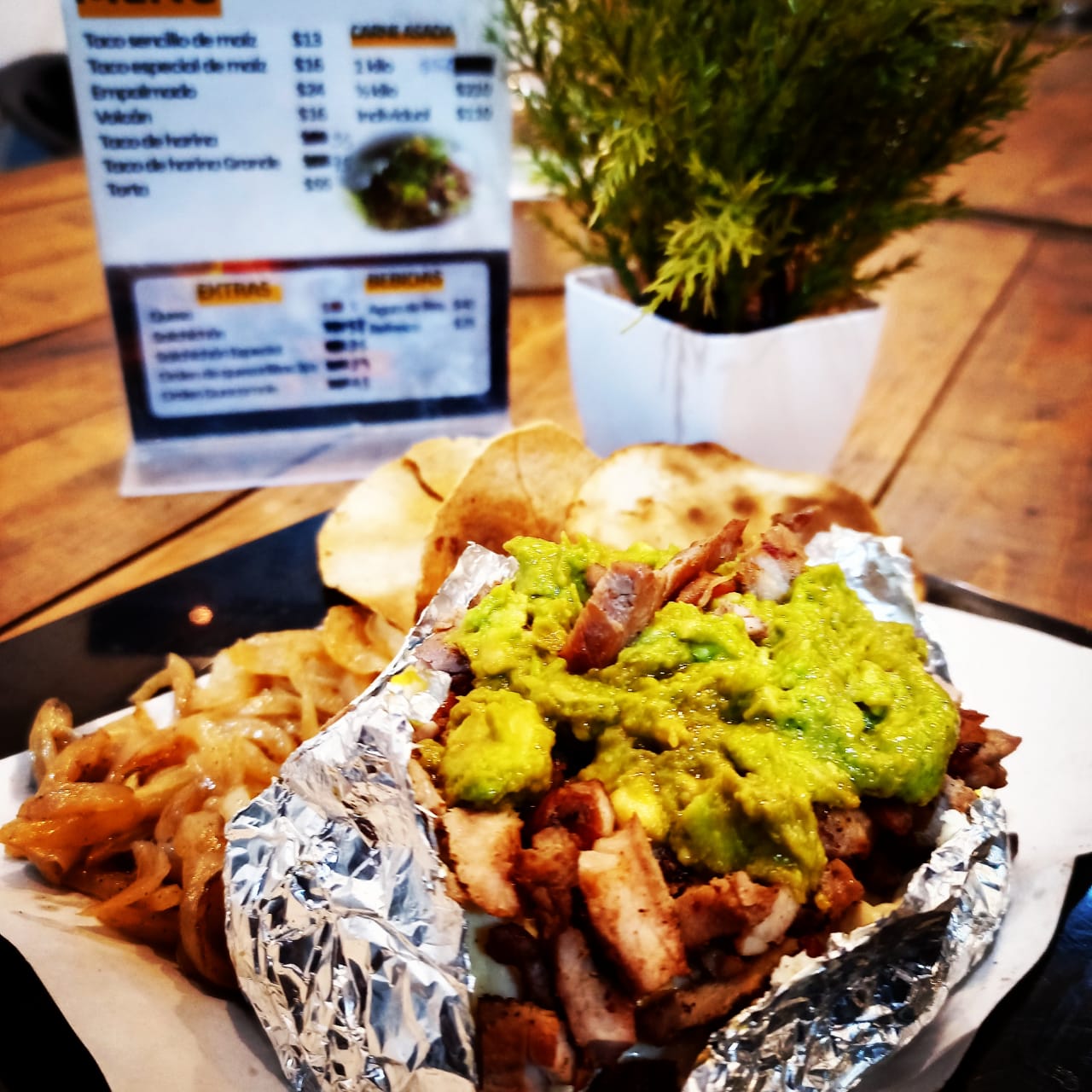 Taco de carne asada en doble tortilla con guacamole acompañado de complementos, cilantro, cebolla, limones y salsas.