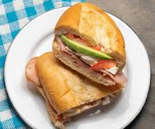 Torta preparada en pan francés crujiente, rellena de carne asada y complementos frescos.