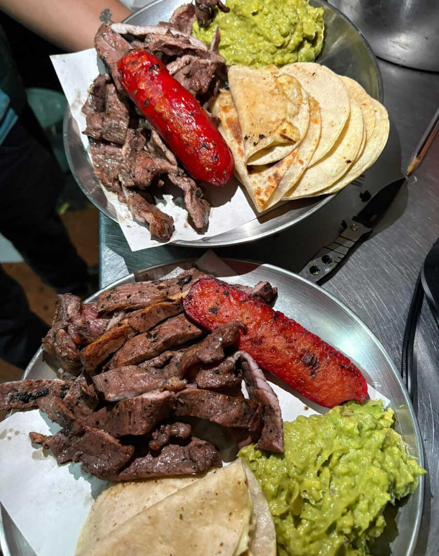 250 g Carne asada, 250 g pastor, 2 frijoles charros, 4 quesadillas, guacamole, 2 mitades de salchichón, cebollitas, tortillas.