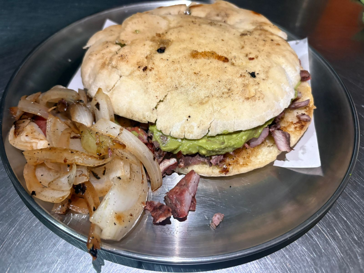 Tortilla de harina o maíz, salchichón asado, carne, guacamole y queso.