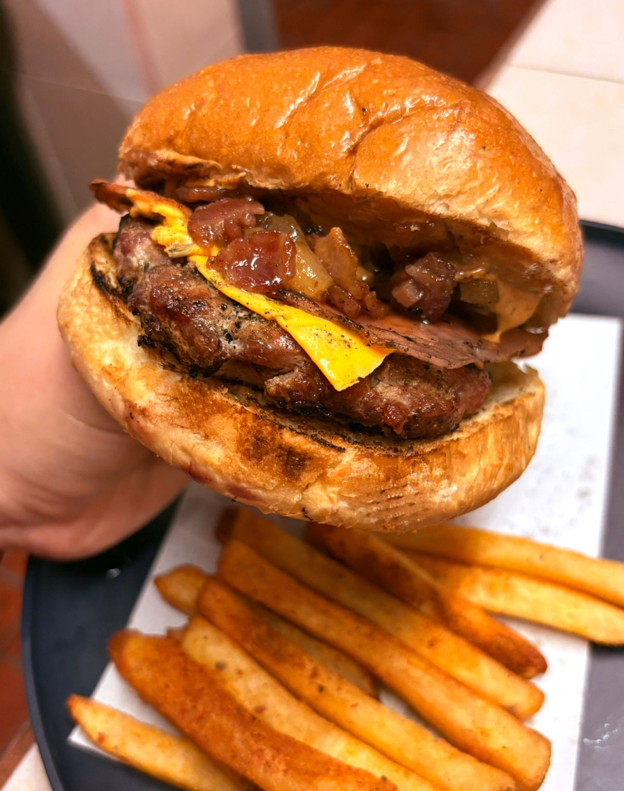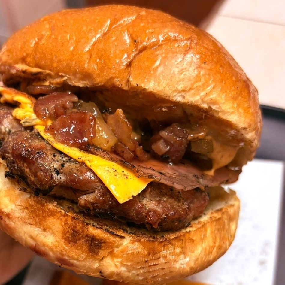 Hamburguesa monumental que combina carne asada al carbón y una rodaja de salchichón asado.