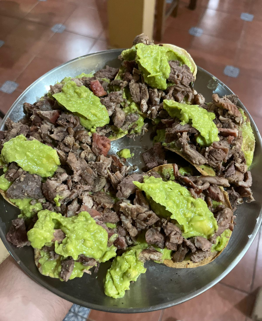 Tortilla de maíz tostada hasta quedar crujiente, cubierta con queso fundido y carne al carbón.