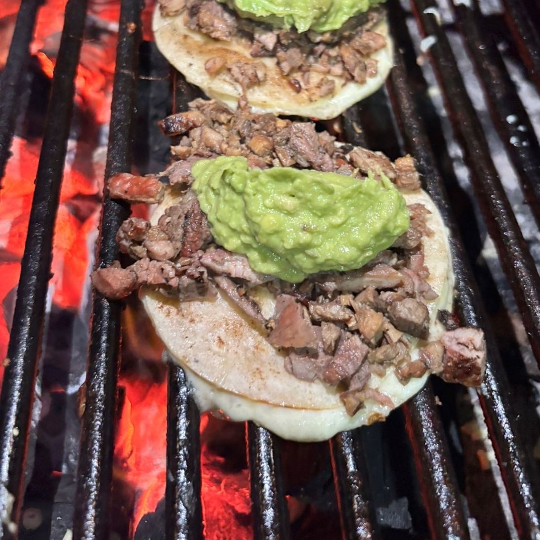1 kg Carne asada, 4 frijoles charros, 6 quesadillas, 4 mitades de salchichón, guacamole, tortillas, cebollitas.