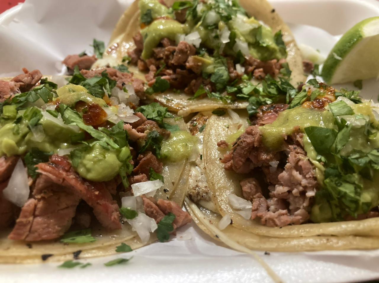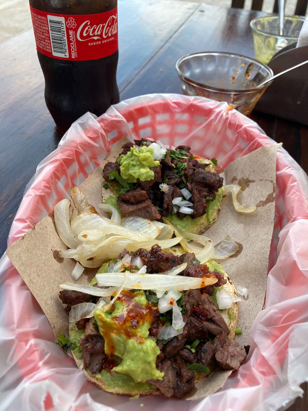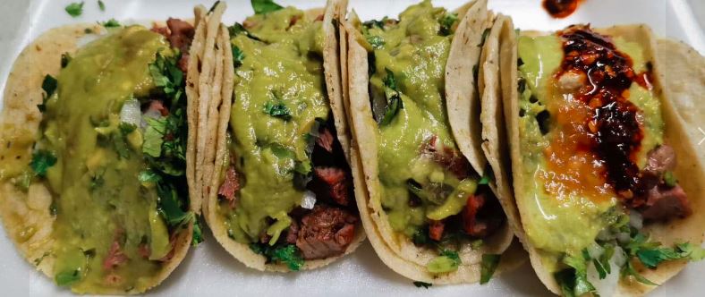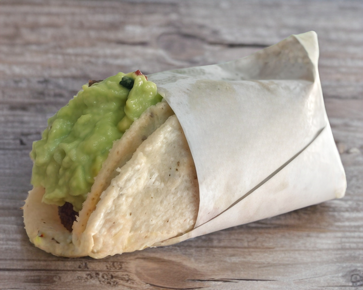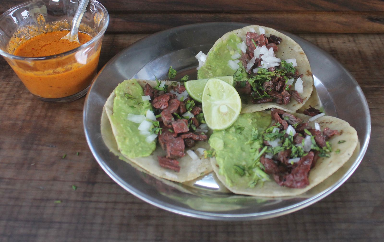 Taco doble tortilla de maíz, carne asada, guacamole, cebolla y cilantro.