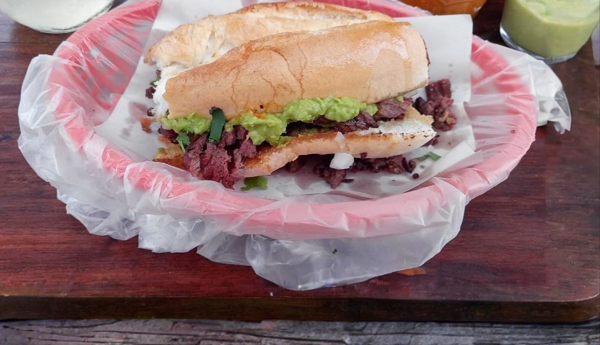 Tortilla de harina, queso asadero, carne asada, guacamole, cebolla y cilantro.
