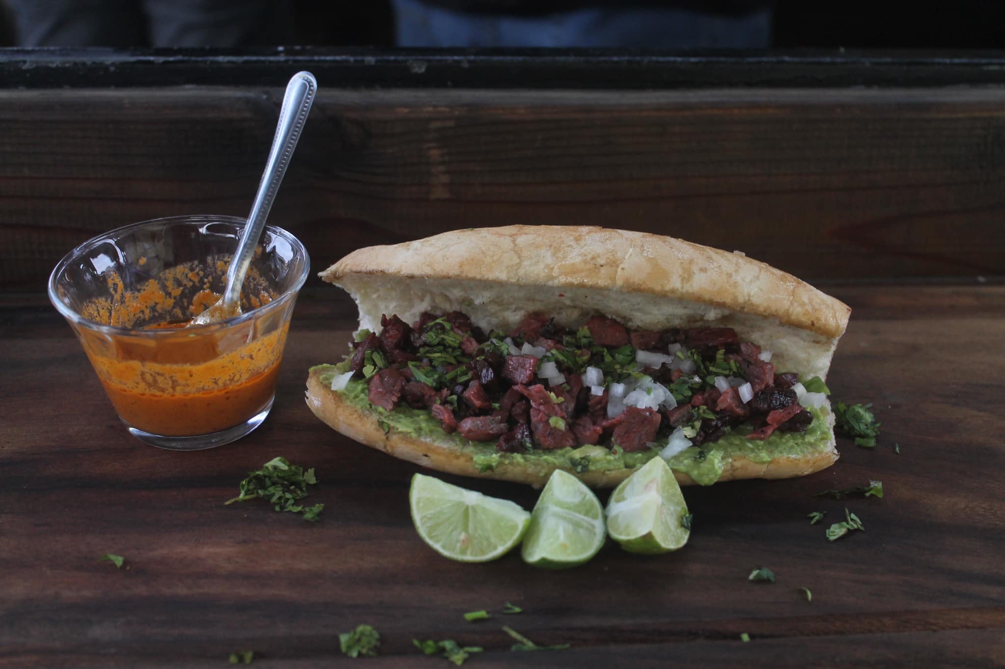 Pan francés, arrachera, guacamole, cebolla, cilantro.