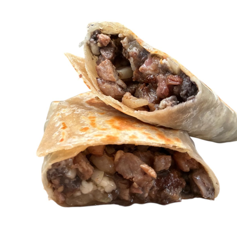 Tortila 23cm, frijoles refritos, carne Rib Eye, queso mix, cebolla caramelizada, aderezos a elegir. Salsa y Limones