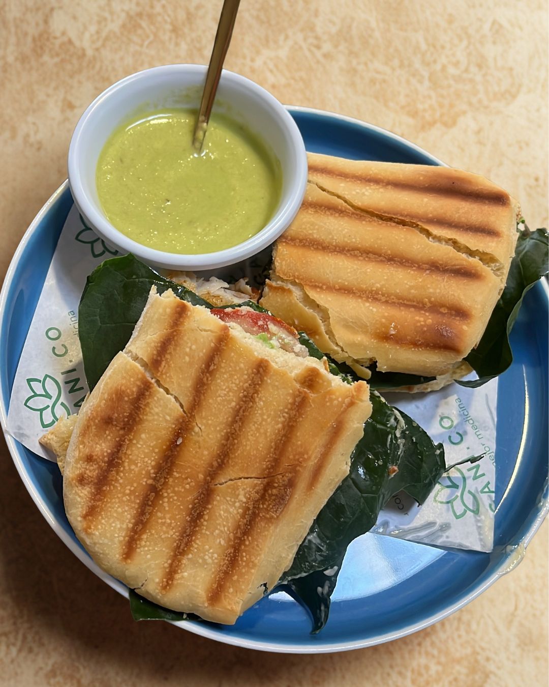 Jamón de pavo, queso panela, espinaca, tomate y aguacate.