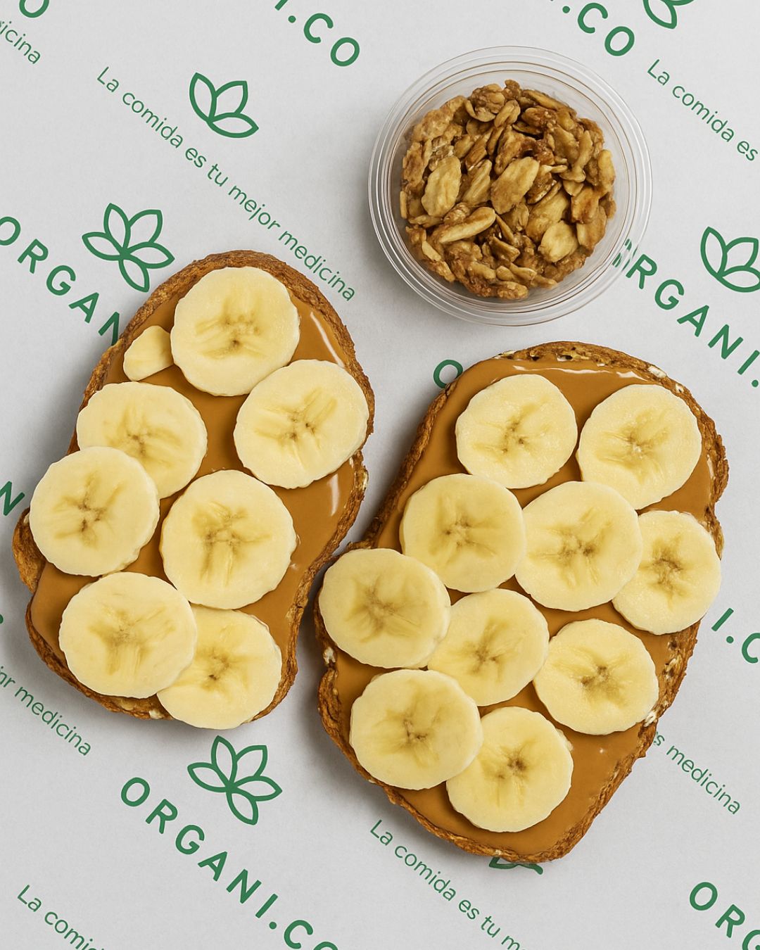 Pan artesanal, corte grueso, crema de cacahuate de la casa, plátano, cacahuate, coco tostado sin azúcar y miel orgánica.
