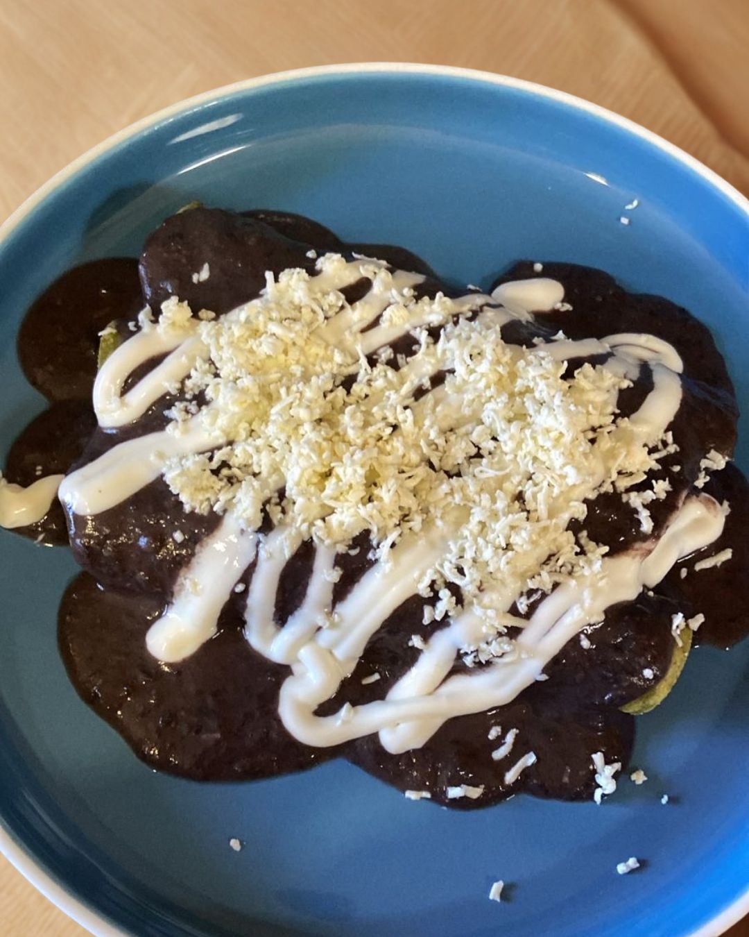 Tortiregia, tortilla de maíz en aceite de coco, queso panela fresco, crema y aguacate.