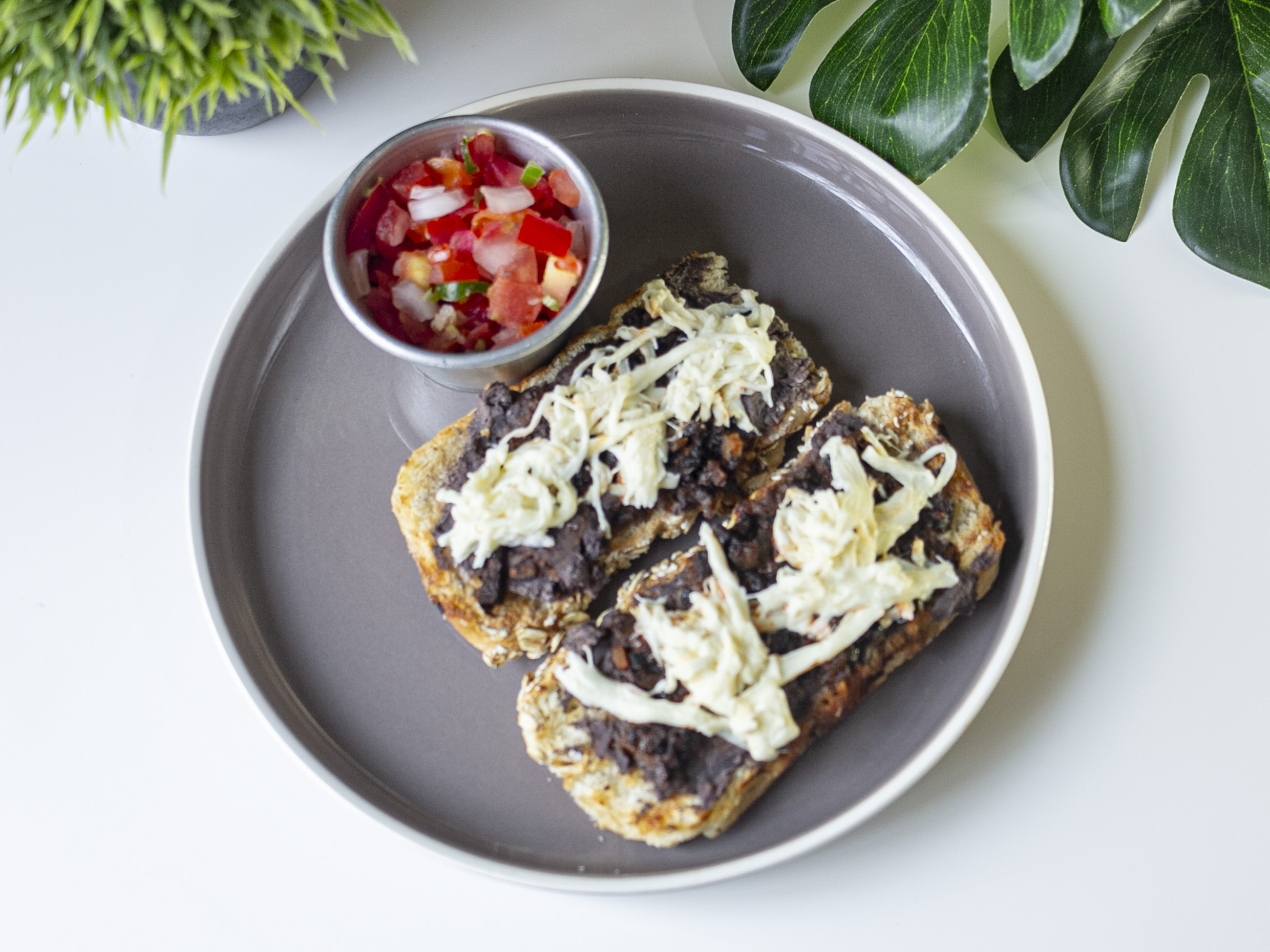 2 Piezas. Pan artesanal corte mediano con frijoles, chorizo de champiñones y queso gratinado, salsa de la casa y pico de gallo.
