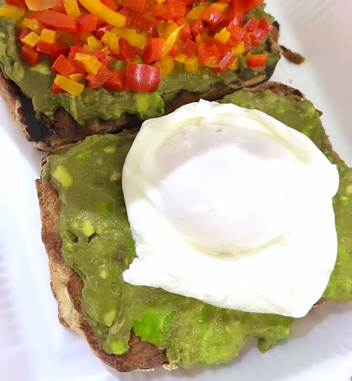 Pan artesanal, corte grueso, guacamole, huevo estrellado y pico de gallo.