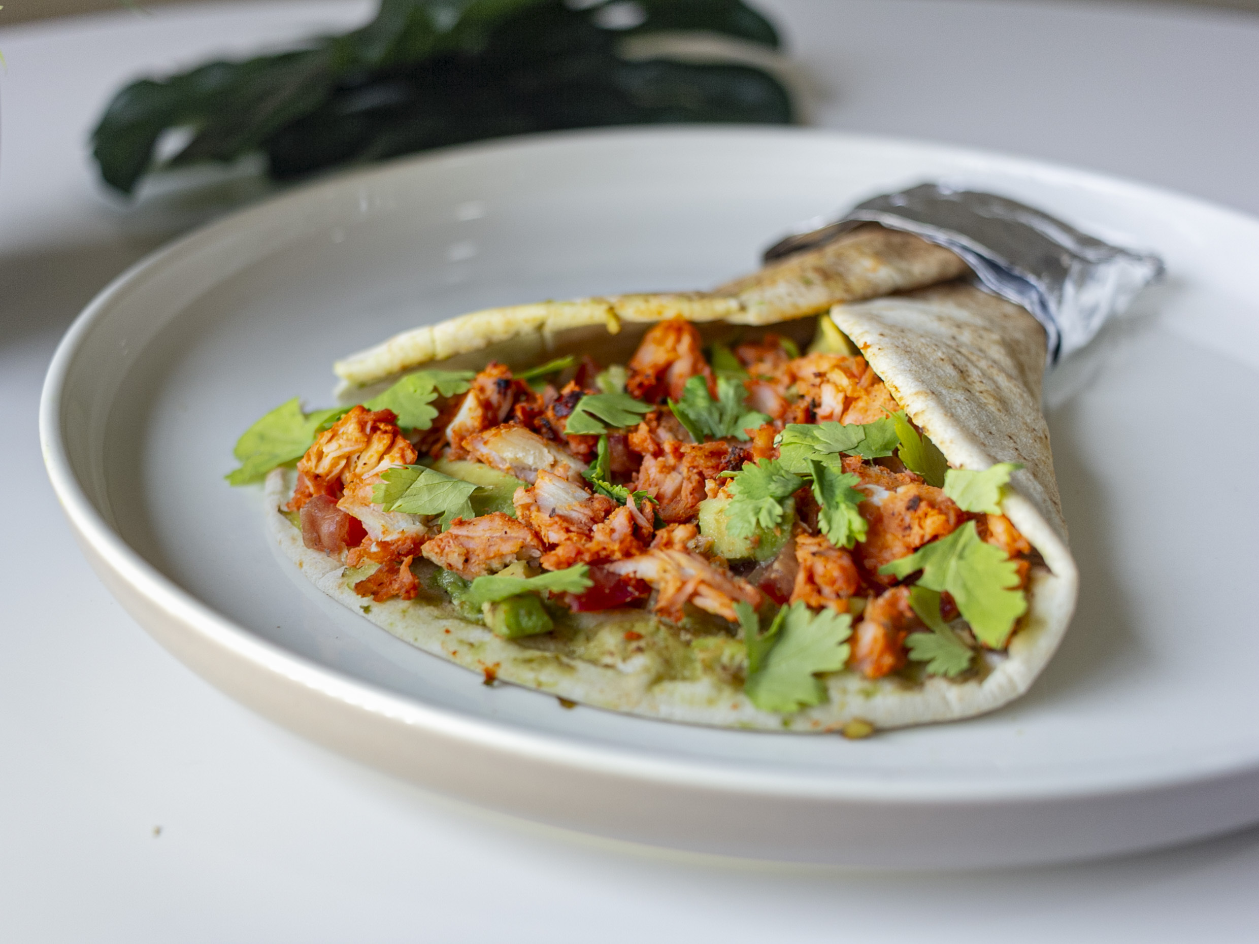 Wrap integral, pollo marinado al pastor, cebolla morada, cilantro, guacamole y salsa de la casa.