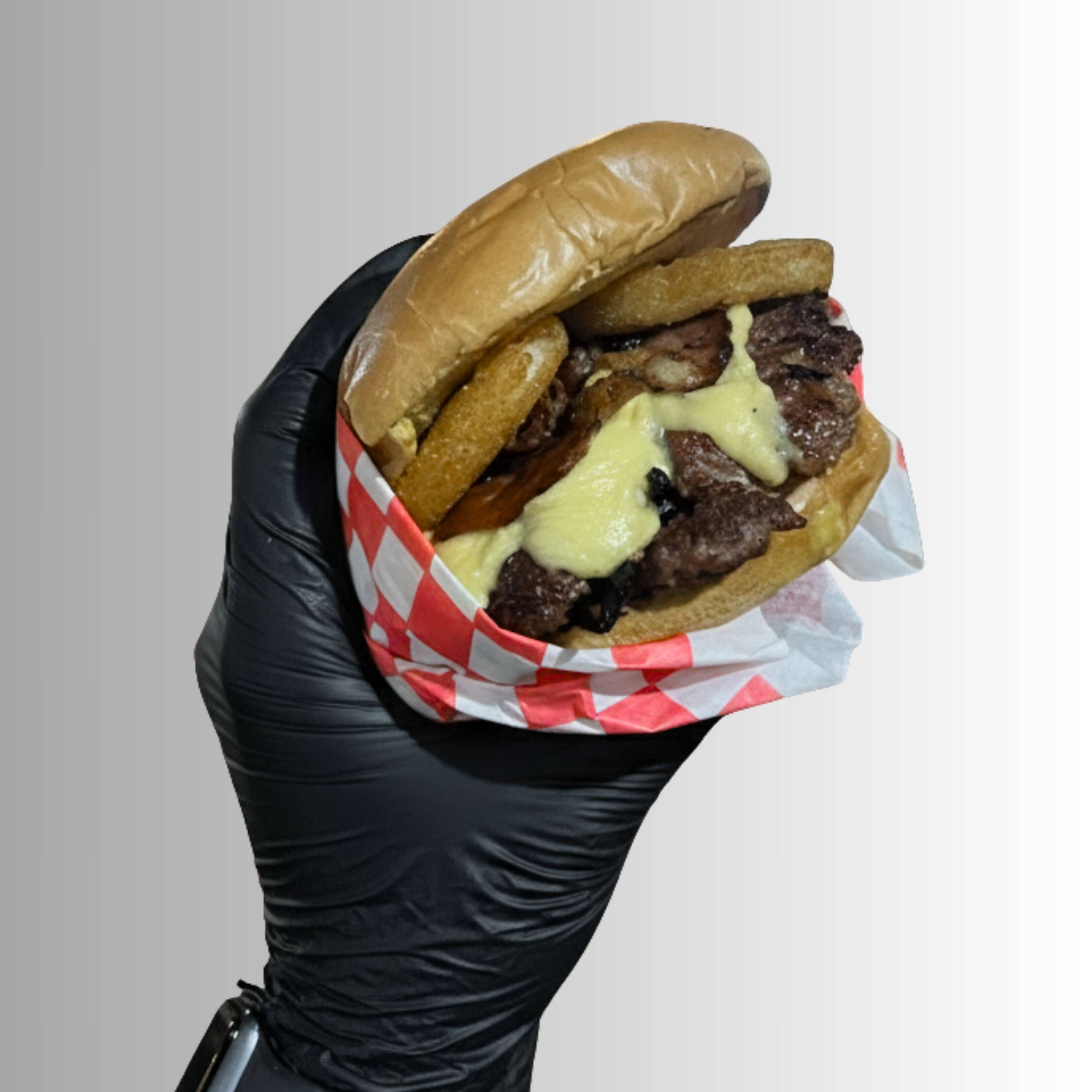 Doble carne de res, aros de cebolla, tocino, cebolla prensada, doble queso manchego o americano, pepinillos, salsa de la casa y pan brioche. Incluye papas a la francesa y un sobre de ketchup y honey mustard.