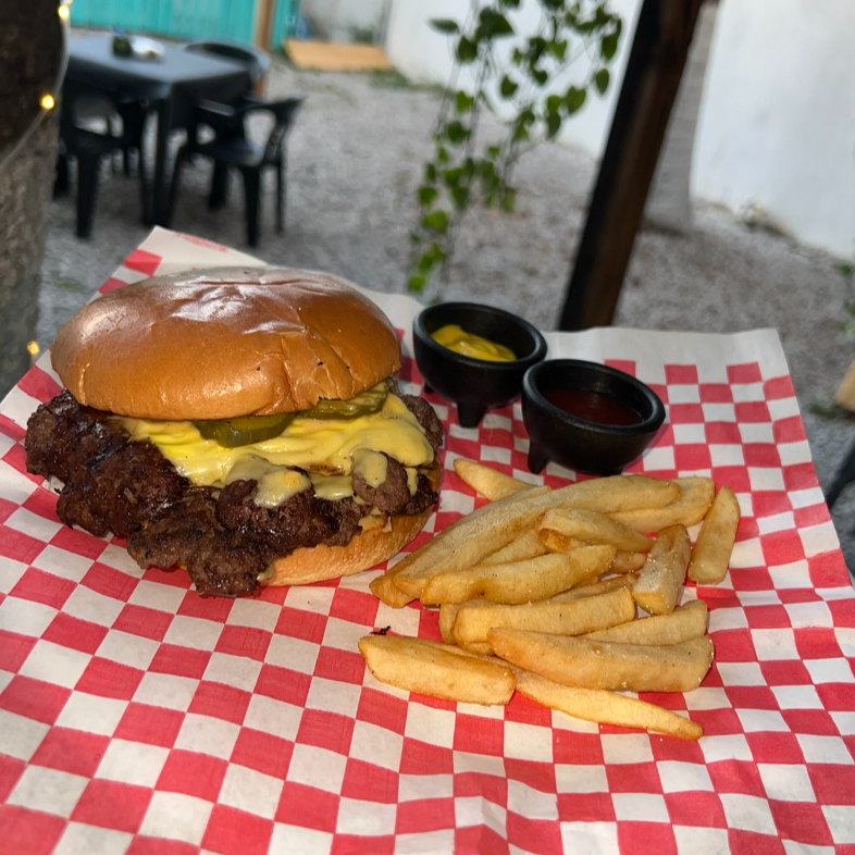 Carne de res, cebolla prensada, queso manchego o americano (amarillo), pepinillos, deliciosa salsa de la casa y pan brioche. Incluye papas a la francesa y un sobre de ketchup y honey mustard.