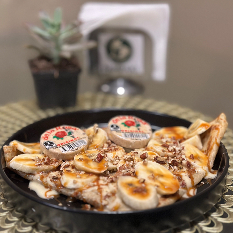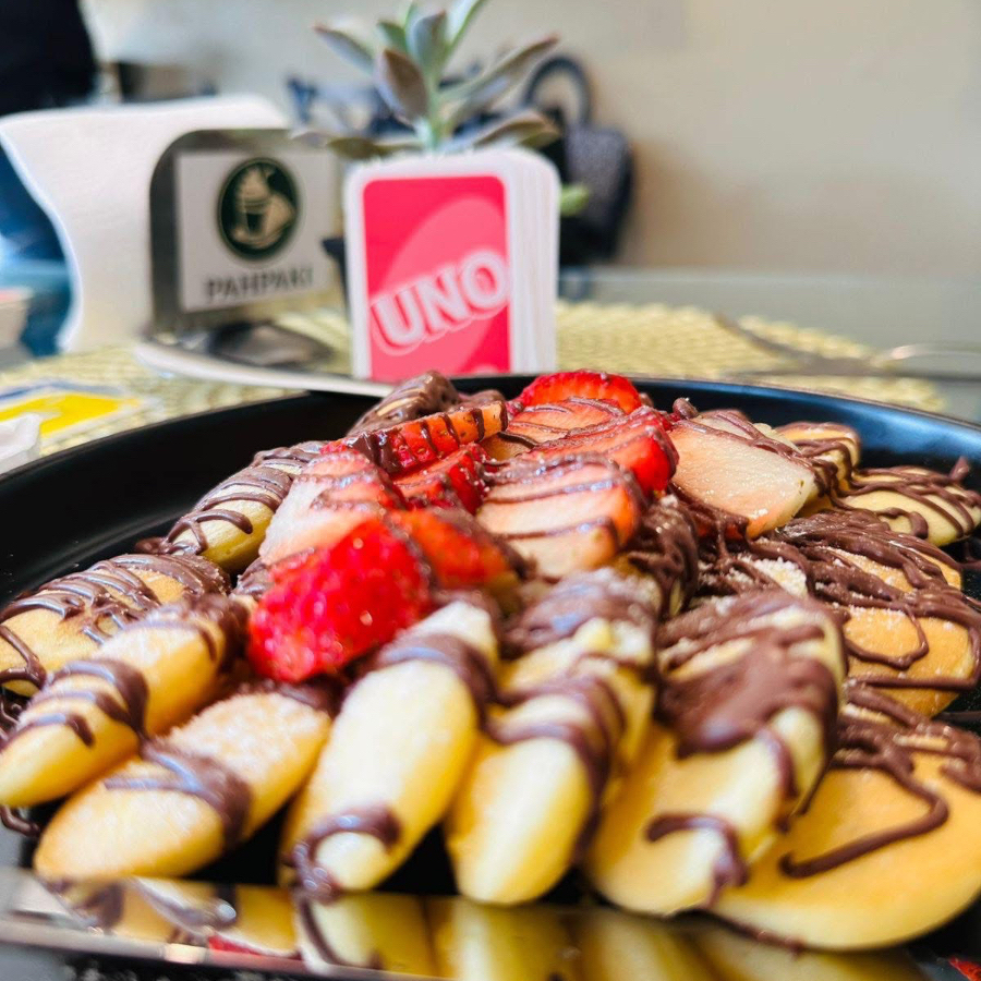 Un toping ya sea fresa, platano, frutos rojos, nutella, cajeta, chocolate hershe`s.