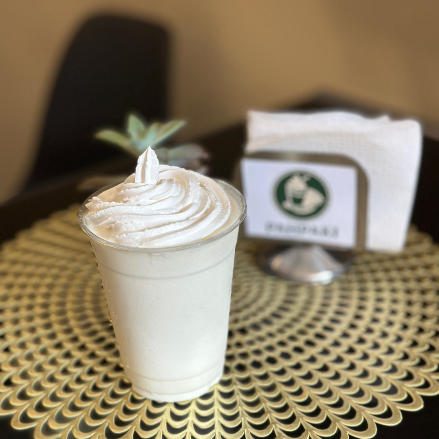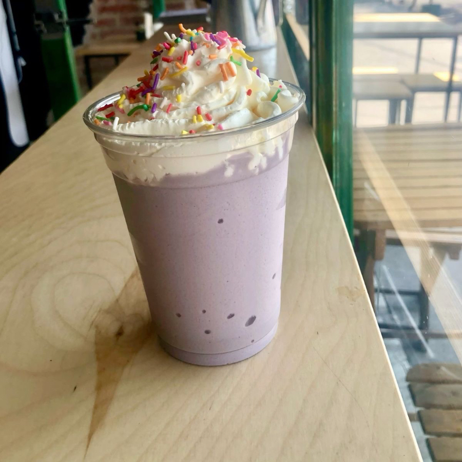Leche entera o deslactosada, Taro, crema batida, chispas.