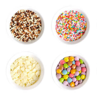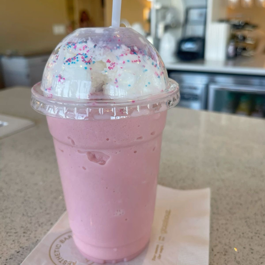 Leche entera o deslactosada, candy strawberry, crema batida, chispas.