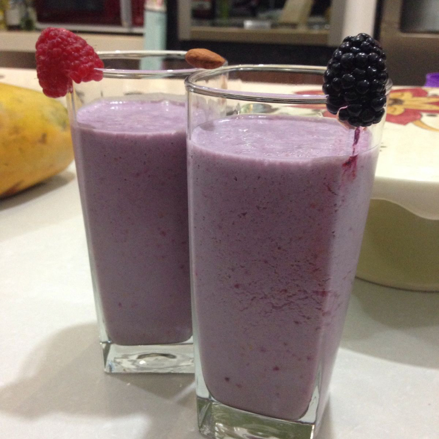 Leche entera o deslactosada, zarzamoras, crema batida, chispas