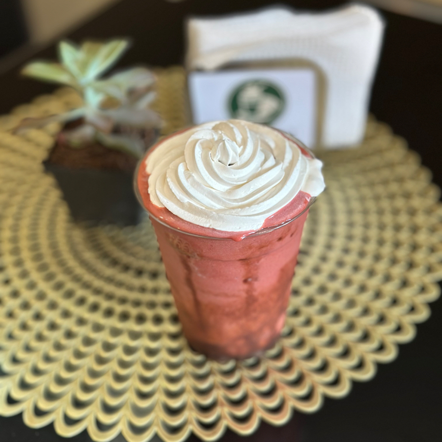 Leche entera o deslactosada, red velvet chocolate, crema batida, chispas.