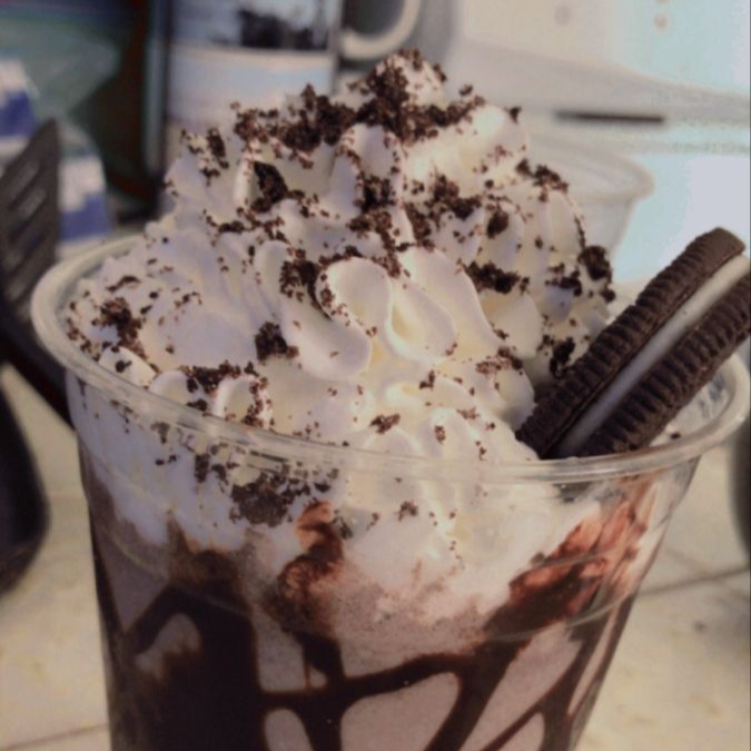 Leche entera o deslactosada, cheesecake, crema batida, chispas.