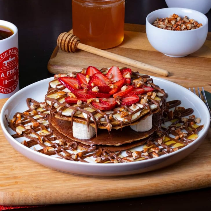 Pancakes grandes sabor fresa con topping de yogurt griego, plátano, fresa, zarzamora, nutella, nuez y miel.