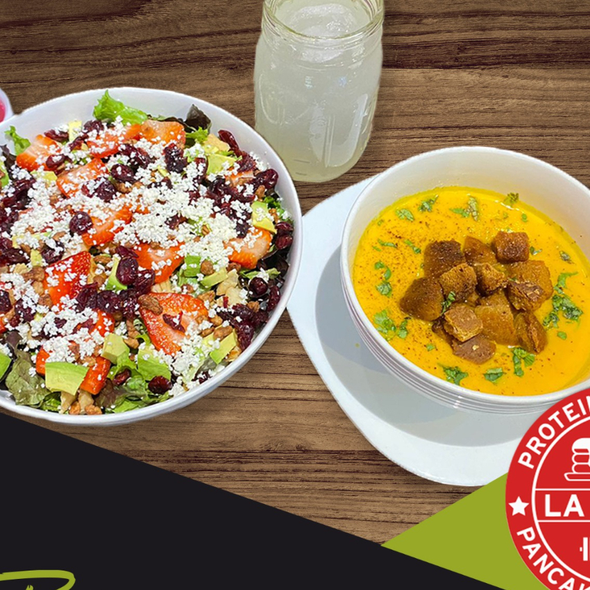 Media ensalada a elección, acompañada con una crema de zanahoria. Incluye una bebida.