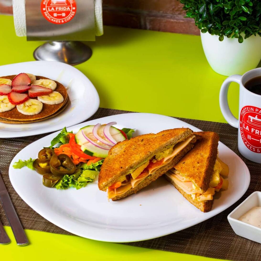 Sándwich con aderezo de aguacate relleno de omelet (relleno de espinacas, panela y champiñones) o de pechuga de pavo (con queso panela y tomate). Acompañado de 2 pancakes chicos de proteína con fresa, plátano y miel. Incluye una bebida.