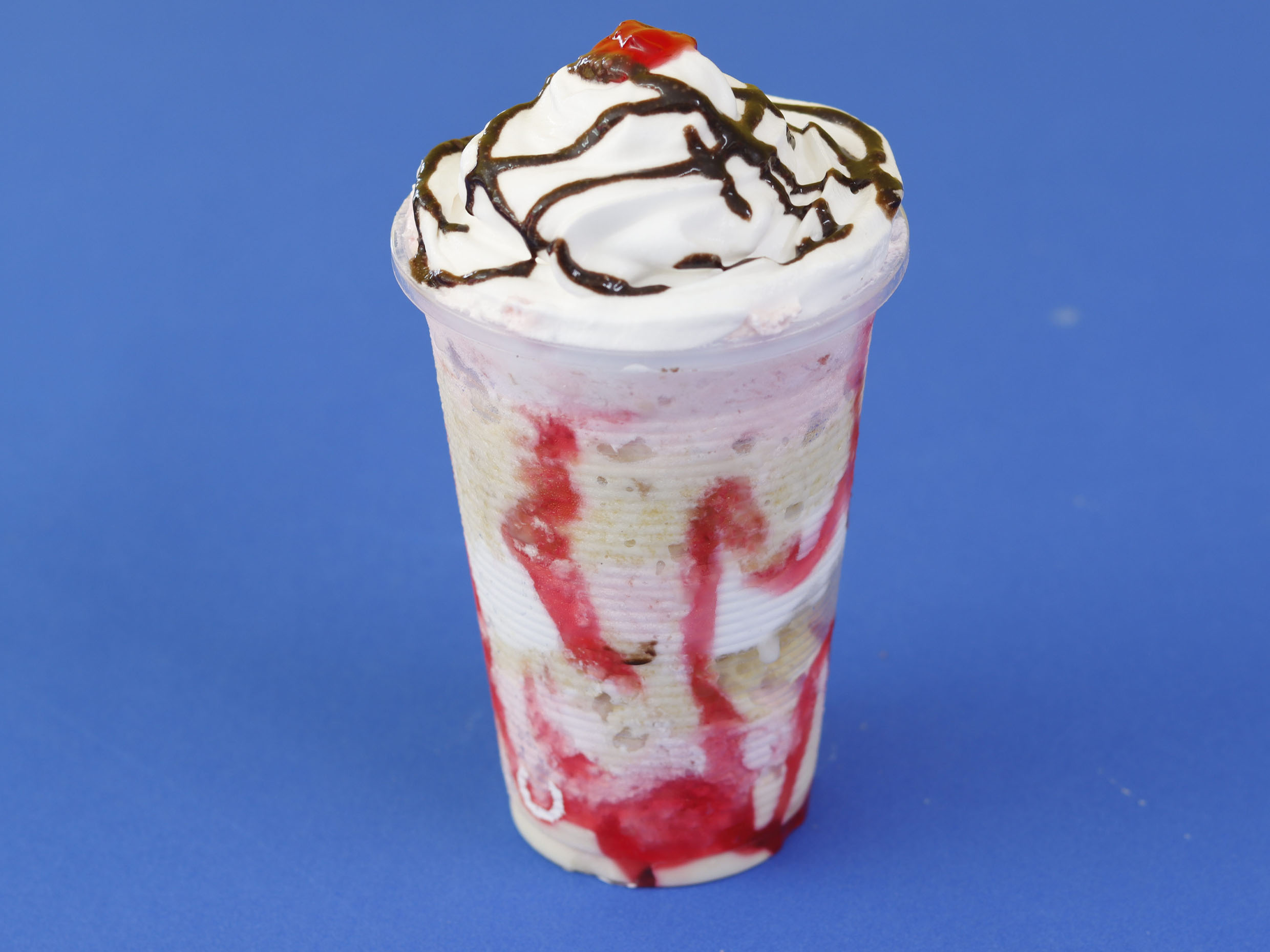 Pan de vainilla bañado en tres leches, relleno de mermelada de fresa y chantilly decorado, fruta de temporada. Individual.