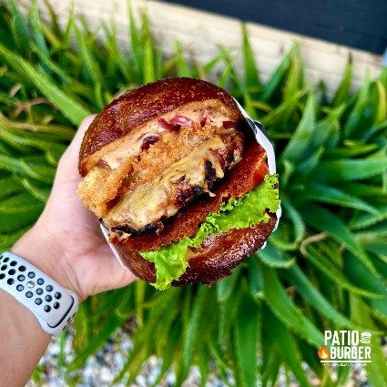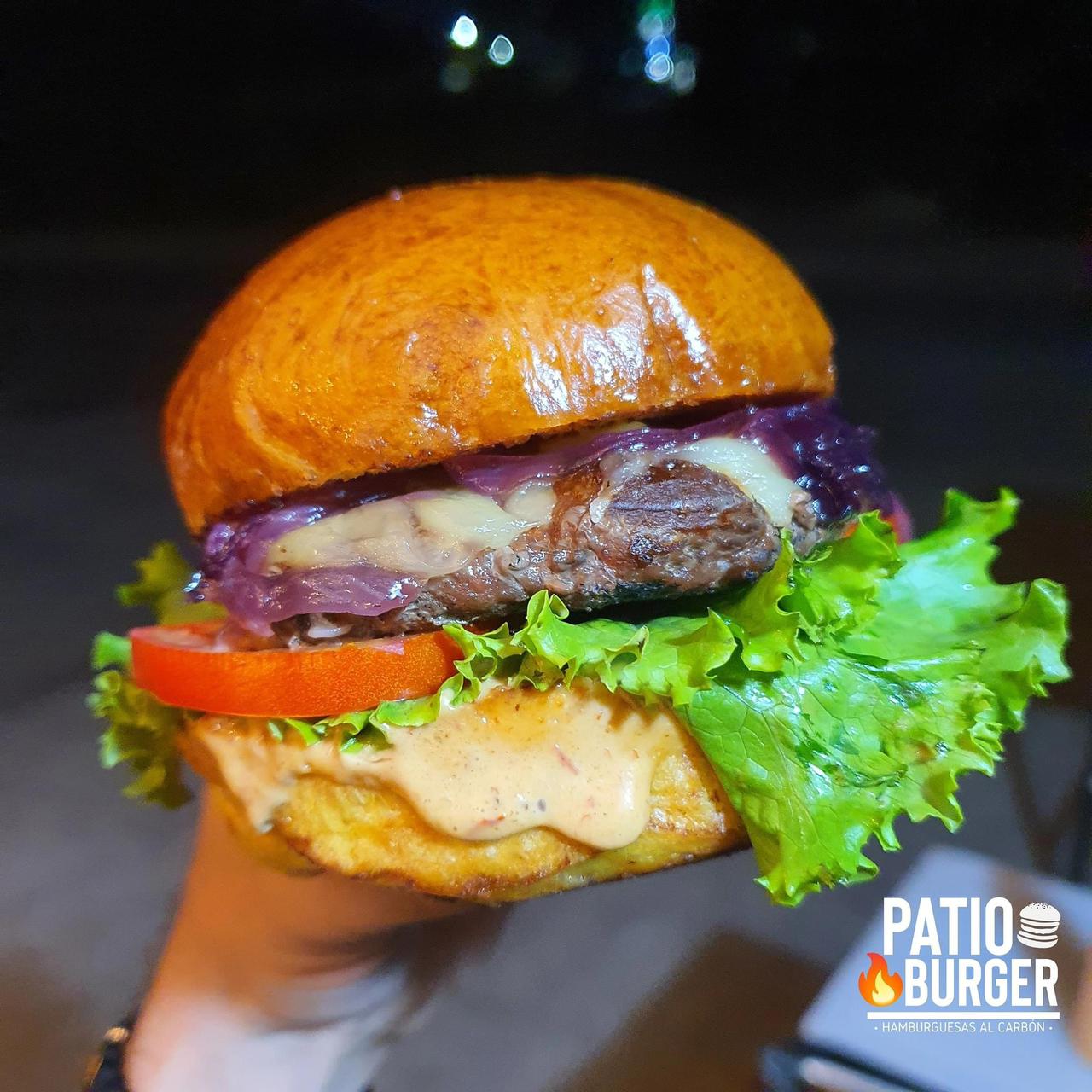 150 gr. de carne, cebolla caramelizada, queso gouda, aros de cebolla, lechuga, tomate y aderezo de chipotle. (incluye papas)