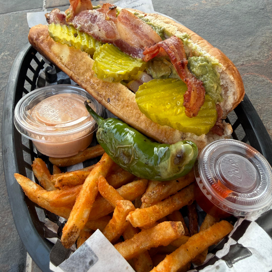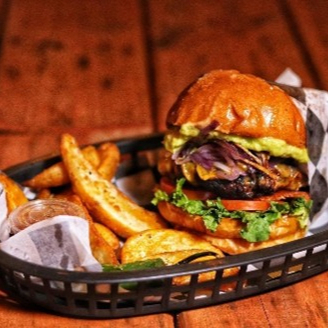 150 gr. de carne, tocino, guacamole, pepinillos, cebolla caramelizada, queso gouda, lechuga, tomate y aderezo de chipotle. (incluye papas)
