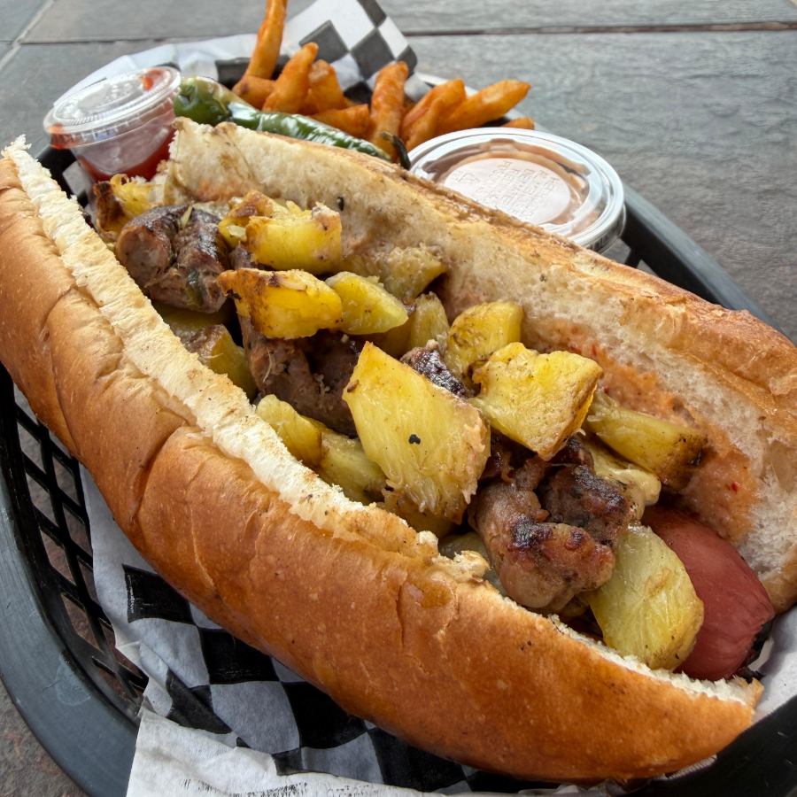 salchicha jumbo, aderezo cacahuate, chistorra, cubos de piña asada y queso gouda gratinado. (No incluye papas)