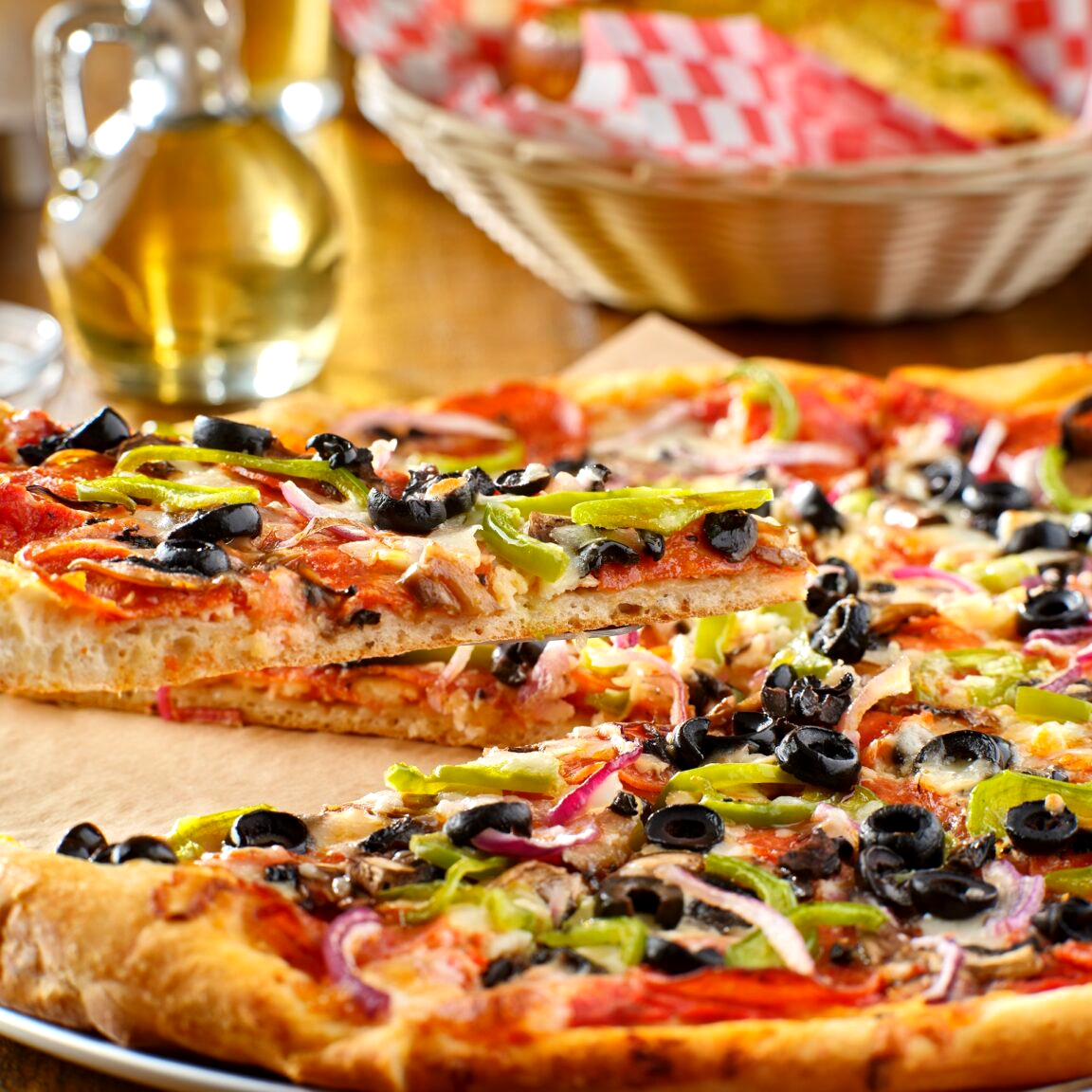 Pizza tamaño grande. Ingredientes: Mezcla de tres quesos, pepperoni, slachicha italiana, pimiento verde, cebolla y aceitunas negras. con orilla bañada en mantequilla de ajo parmesano