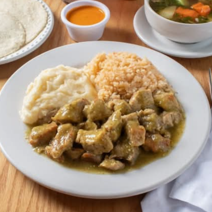 Chile relleno de queso o carne con 2 guarniciones, sopa, pan o tortilla y bebida.