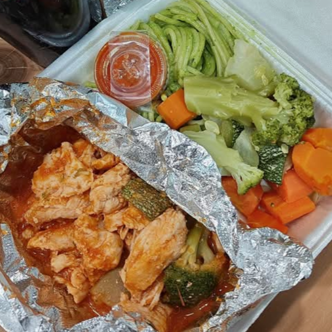 Ensalada de pollo con 2 guarniciones, sopa, pan o tortilla o galletas y bebida.