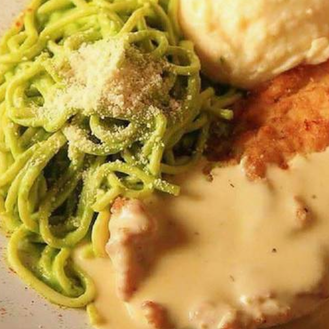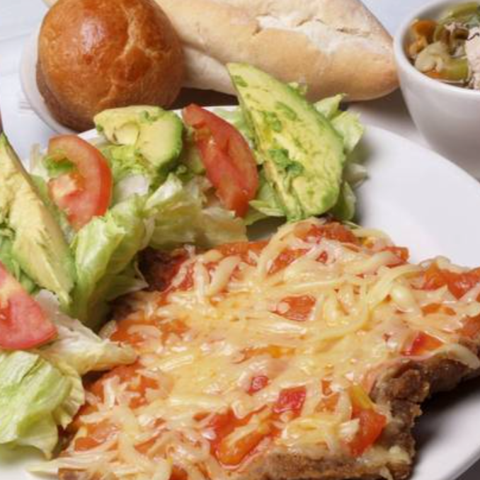 Milanesa de pollo con salsa italiana, queso manchego y parmesano acompañada de 2 guarniciones a elegir, pan o tortillas y salsa.