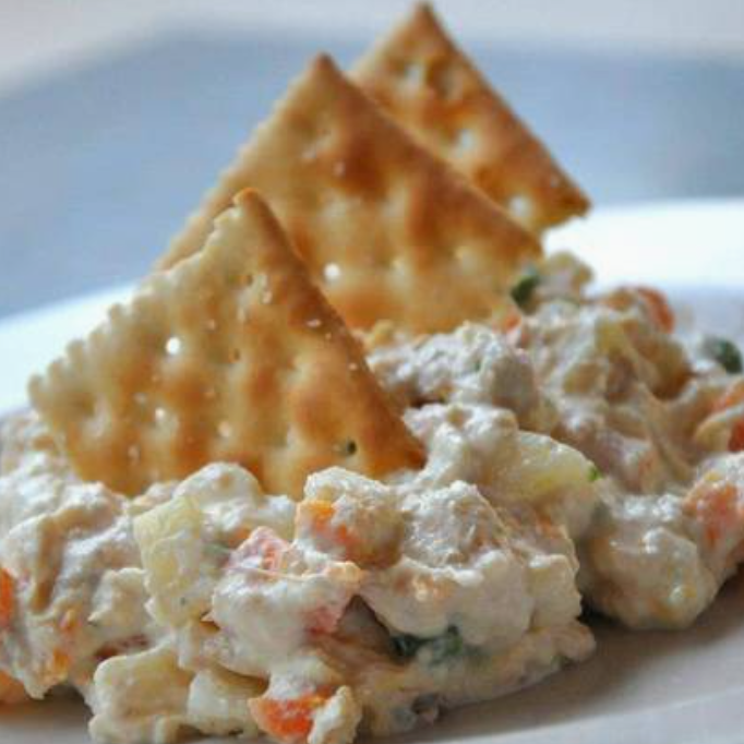Ensalada de pollo acompañada de 2 guarniciones, galletas saladas y salsa.