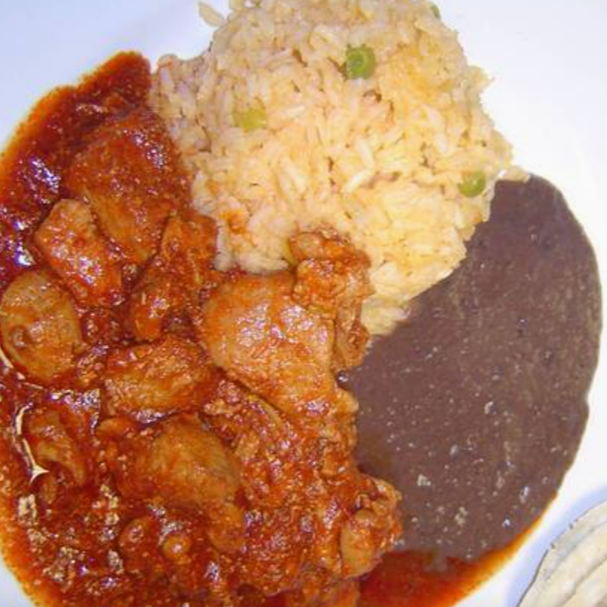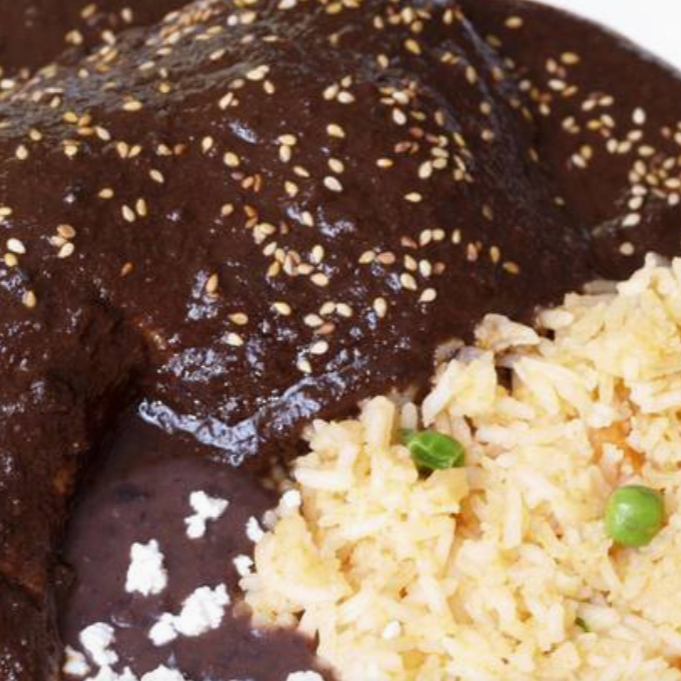 Platillo de pollo en mole con arroz blanco.