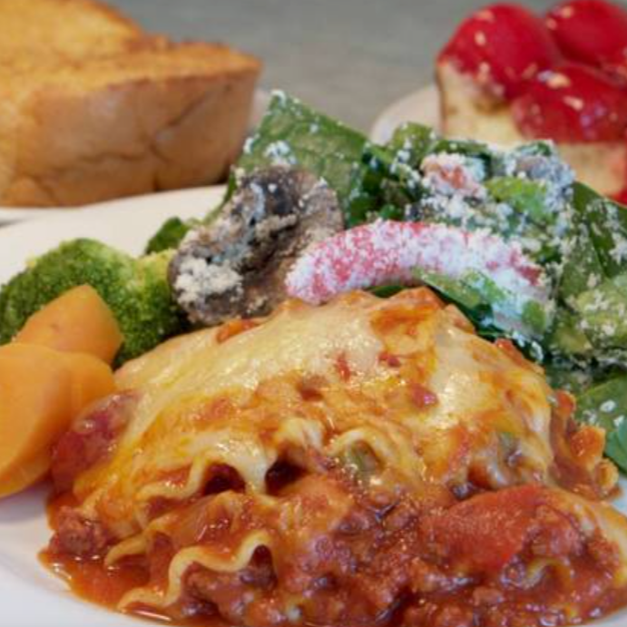 Lasaña de carne con 2 guarniciones a elegir, sopa, pan o tortillas y bebida.