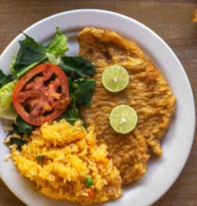 Milanesa de res portuguesa, 2 guarniciones, sopa, pan o tortilla y bebida.