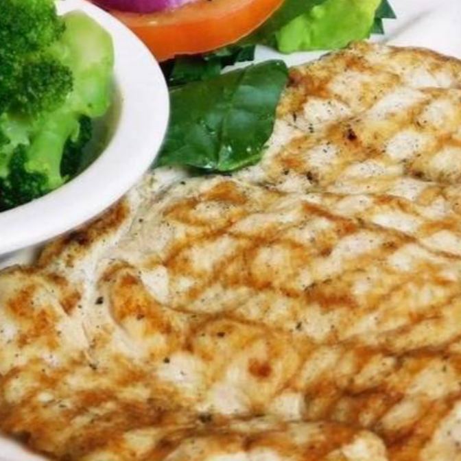 Pechuga asada con 2 guarniciones a elegir, tortillas recién hechas y salsa.