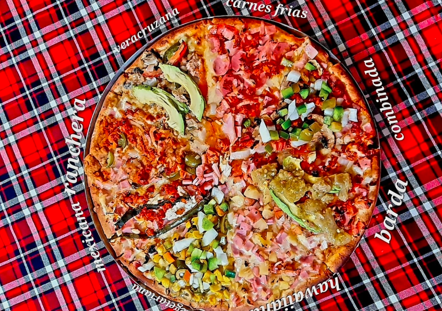 Pizza con atún, champiñón, cebolla, aguacate, jalapeño y tomate.