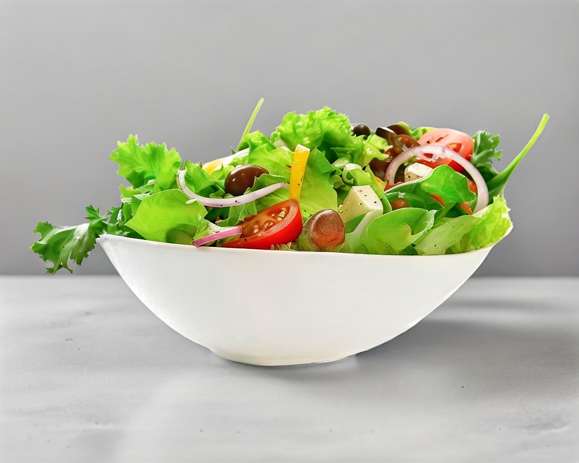 Ensalada individual con lechuga, tomate, cebolla morada, aceituna, col morada y aderezo de la casa.