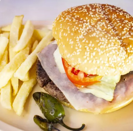 JUGOSA CARNE DE RES, QUESO AMARILLO, JAMON, LECHUGA, TOMATE, CEBOLLA, CATSUP Y 150 GRS DE PAPAS FRITAS.