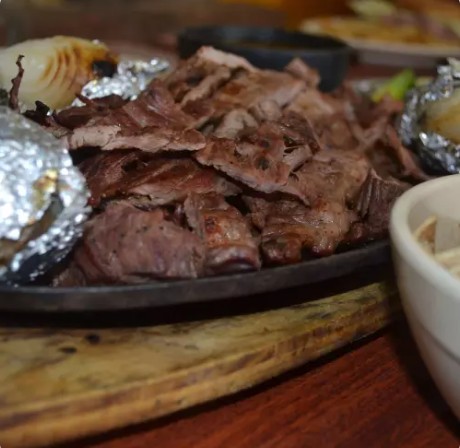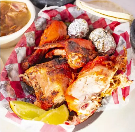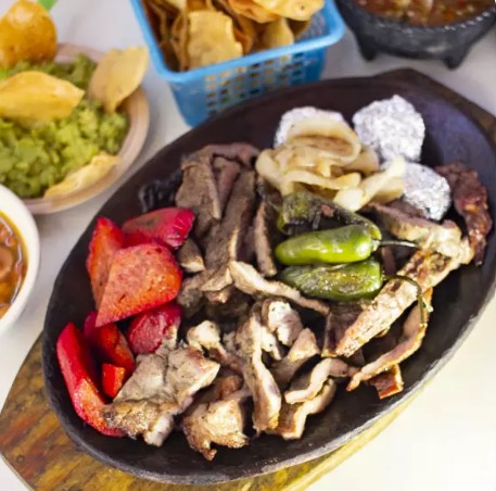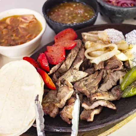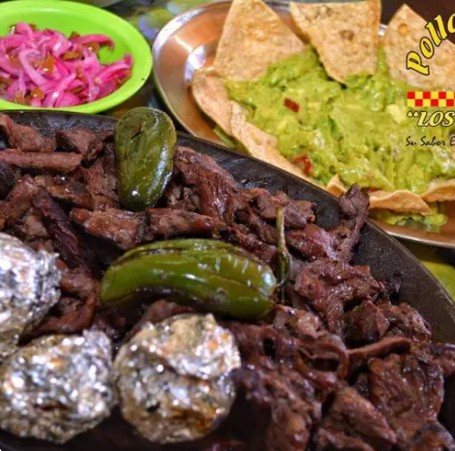 CARNE A ELECCION, 2 PIEZAS DE POLLO ASADO, 1/4 DE FRIJOLES CHARROS, TORTILLAS, SALSA, CEBOLLITAS ASADAS, 100 GRS DE GUACAMOLE, TOTOPOS, LIMONES Y CHILES TOREADOS.