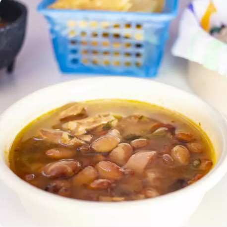 MEDIO LITRO DE FRIJOLES CHARROS, TORTILLAS, 2 SALSAS, CEBOLLITAS ASADAS, 150 GRS DE GUACAMOLE, TOTOPOS Y CHILES TOREADOS.