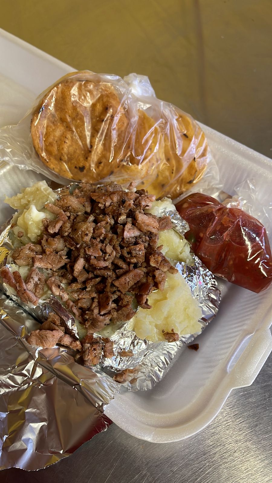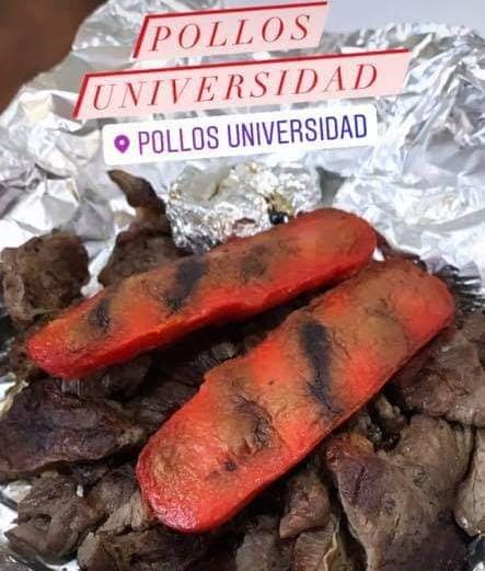1 pollo asado, 1/2 kg carne asada, 1/2 litro frijoles charros, 1 papa sencilla, salsa, tortilla, cebolla, limón y totopo.